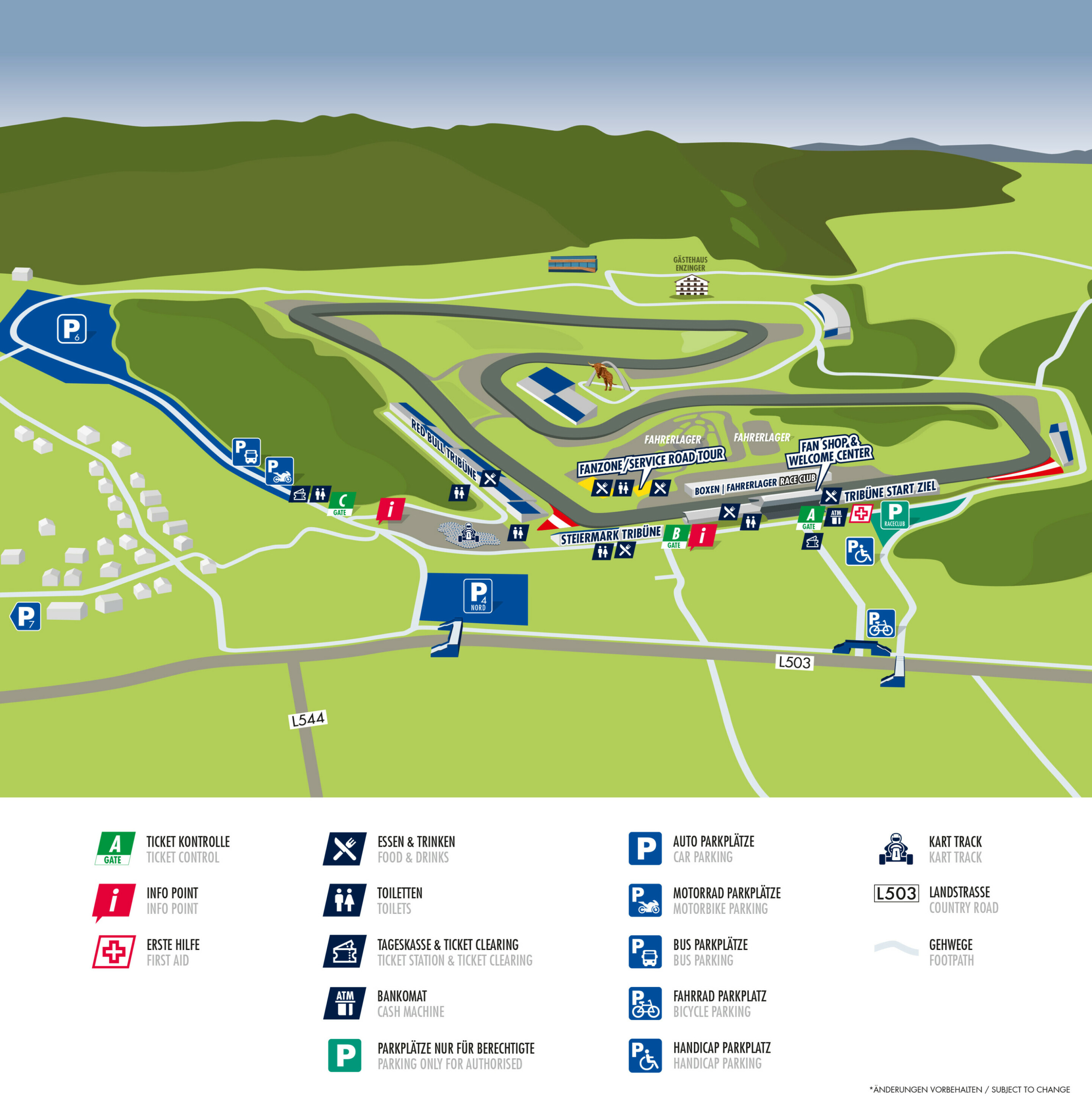 Ab 07:00 Uhr kannst du täglich dein Auto oder Motorrad auf den Parkplätzen (Auto P4; Motorrad Westschleife) parken – natürlich kostenlos und in Gehdistanz zum Red Bull Ring. Rollstuhlfahrer haben einen eigenen Parkplatz.