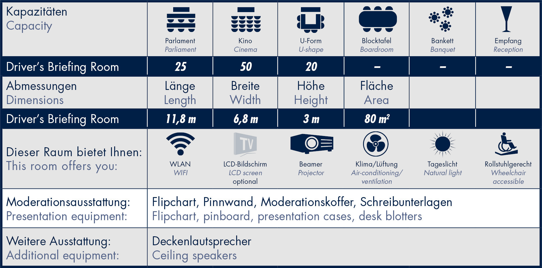 Bucht den Driver‘s Briefing Room und taucht tief in die Welt des Red Bull Ring ein. Egal ob Valentino Rossi oder Max Verstappen, sie alle haben schon im Driver‘s Briefing Room Platz genommen. Keine Frage, diese Location bietet echtes Backstage-Feeling und ist damit der perfekte Ort für zum Beispiel eure nächste Schulung. 80 Quadratmeter groß und mit moderner Technik ausgestattet, bietet der Driver‘s Briefing Room Platz für bis zu 50 Personen.