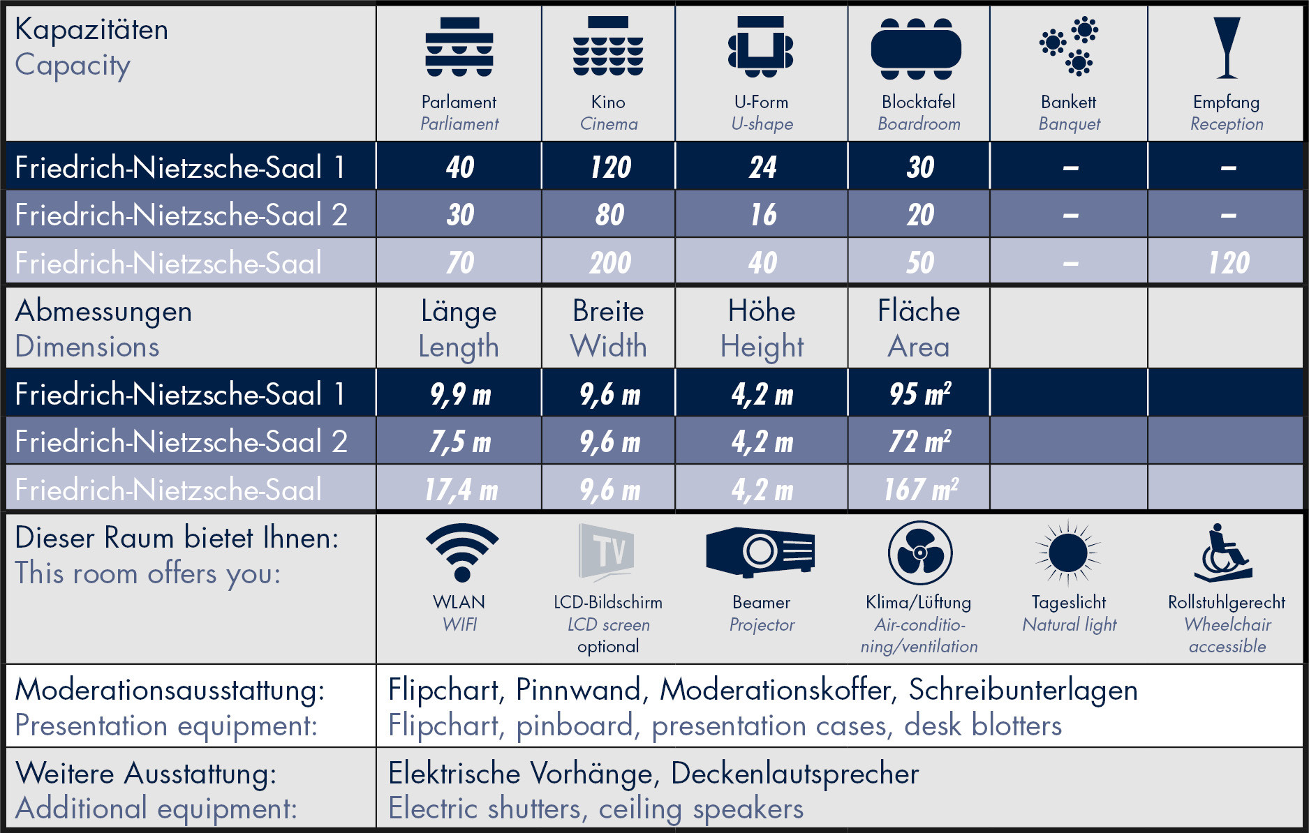 Neue und klare Sichtweisen entstehen am besten in klaren Räumen. Der Friedrich-Nietzsche-Saal überzeugt mit einer lichtdurchfluteten Atmosphäre, brillanter Akustik und moderner Präsentationstechnik. Der 167 Quadratmeter große Saal mit Blick in den Schlosshof bietet bis zu 200 Personen Platz.
