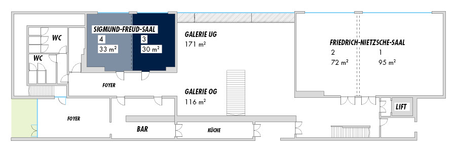 Modern, smart und mit Blick ins Grüne. Der 63 Quadratmeter große Sigmund-Freud-Saal bietet den perfekten, repräsentativen Rahmen für private und geschäftliche Anlässe. Die Teilnehmer werden über den historischen Eingangsbereich des Schlosses genauso staunen wie über die zeitgemäße technische Ausstattung des Saals.