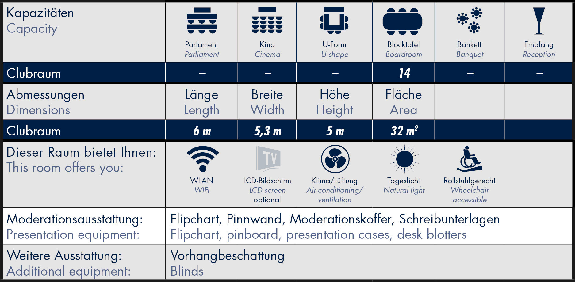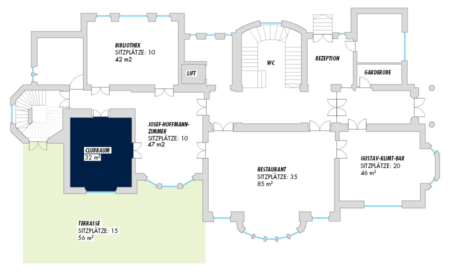 A special space to celebrate big moments in a small group. In combination with the adjoining library and the “Josef-Hoffmann-Zimmer”, the elegant “Clubraum” is quite simply made for stylish receptions. You can also retreat to the 14 square-metre room and use the unique atmosphere with its high ceilings, arched windows and a unique marble table for stimulating conversations or discussions in small groups.
