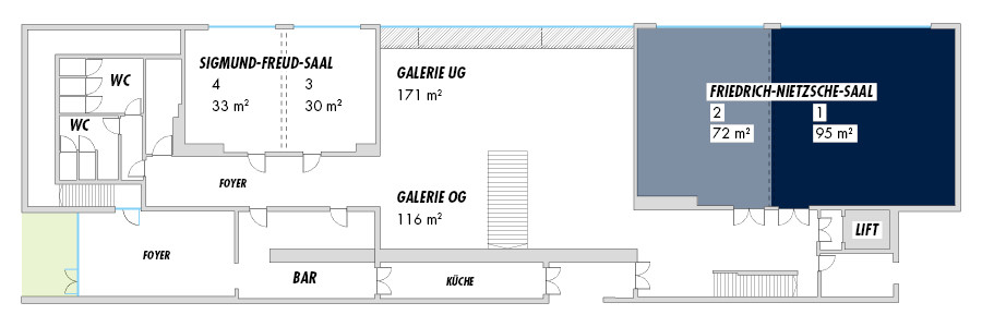 New and clear perspectives are best created in clear spaces. The “Friedrich-Nietzsche-Saal” amazes with its light-suffused atmosphere, brilliant acoustics and modern presentation technology. The 167 square-metre hall with its view of the castle courtyard can accommodate up to 200 people.