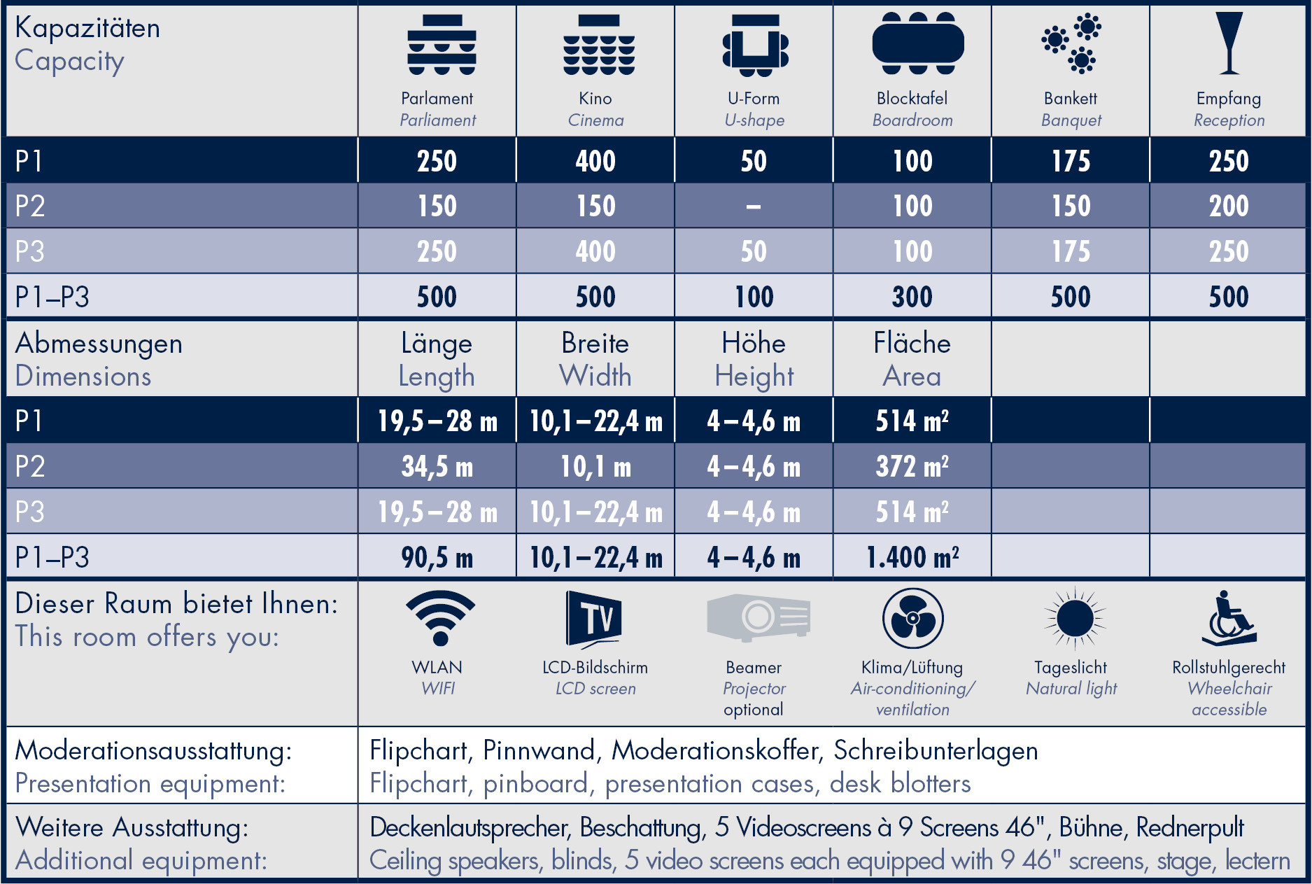 Now for the best bit – the flexible room concept with mobile partitions makes it possible to split the huge Red Bull Wing (P1 – P3), which is used as an international media center at major events, into three rooms – tailored to the occasion and the number of people. Whether there are 50 or 500 participants – the open, friendly and spacious rooms leave nothing to be desired.