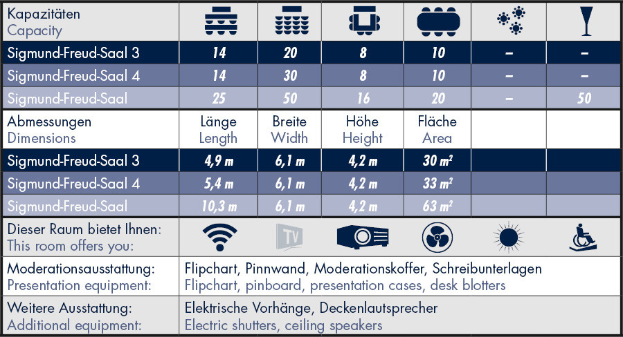 It’s modern, smart and offers a view of the countryside. The 63 square-metre “Sigmund-Freud-Saal” offers a perfect and prestigious setting for private and business events. Participants will be amazed by the historic entrance area of the castle as well as by the contemporary tech-equipment in the hall.